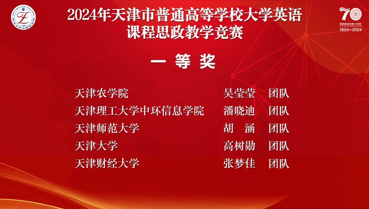 2024年9月21日,天津市普通高等学校大学英语课程思政教学竞赛决赛在天津大学北洋园圆满落下帷幕。我院马小浩老师教学团队凭借出色的表现脱颖而出,以第一名的成绩荣获特等奖并将代表天津参加全国“外语课程思政优秀教学案例征集与交流活动”。我院高树勋老师教学团队荣获一等奖,殷世宇老师教学团队荣获二等奖。