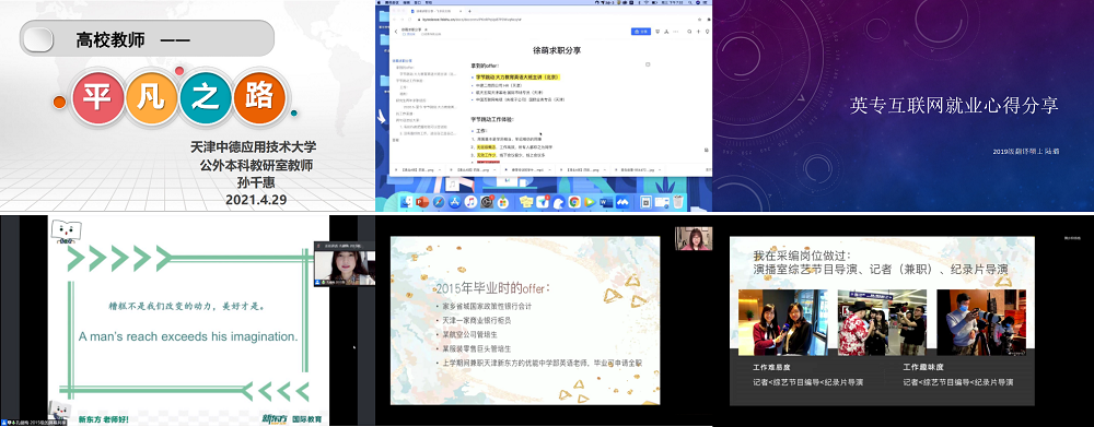 同时,为解答同学们对于中小学教师岗的困惑,活动邀请到就职于天津市第一中学的2018级翻译硕士王心、就职于深圳市大鹏新区教师岗的2018级翻译硕士吴晨钰以及就职于天津外国语大学附属滨海外国语学校的2018级翻译硕士崔競月三人,对成为教师所要必备的素质进行了介绍。就业于北京新东方的2015级翻译硕士孔健梅也向同学们讲述了她的心得体会,并细致讲解了相关的职业成长及规划,使参会同学加深了对于未来求职的规划和思考。