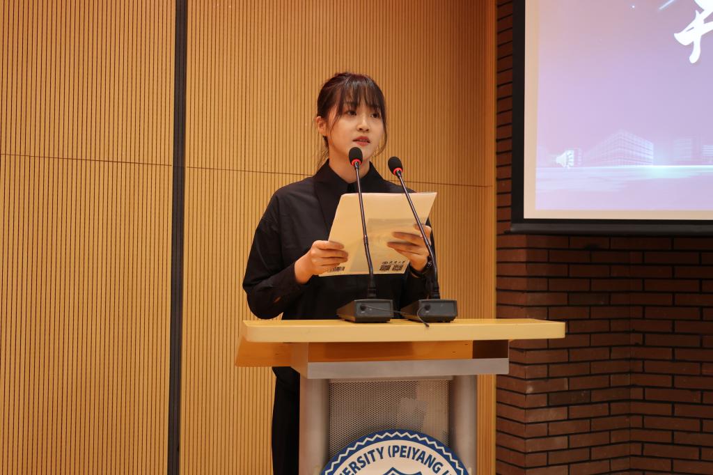 典礼在庄重的国歌声中拉开序幕。随后,老生代表2021级翻译硕士邹玉分享了自己为期一年的研究生支教工作经验,并勉励大家不要畏惧人工智能的横空出世。“没有人会因为坐着直升机登上珠穆朗玛峰而倍感自豪。”同时,她希望学弟学妹可以做一个奉献者,以烛火之亮见点点星光,也要做一个奋斗者,既能志存高远,又要脚踏实地,实事求是。