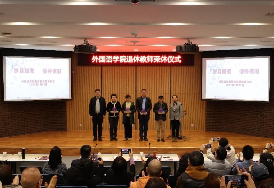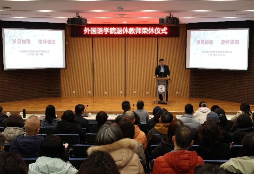 随后,退休教师荣休仪式举行。来自学院大学英语教学二部的周一兵老师、小语种教学部的刘伟老师、研究生外语教学部的张悦老师、大学英语教学一部的许伟利老师作为荣休教师代表发表退休感言,分享在岗多年来的工作感悟与体会,表达了对学校教育事业的深切热爱和不舍之情,同时也寄语了对学院发展的美好希望和祝福。