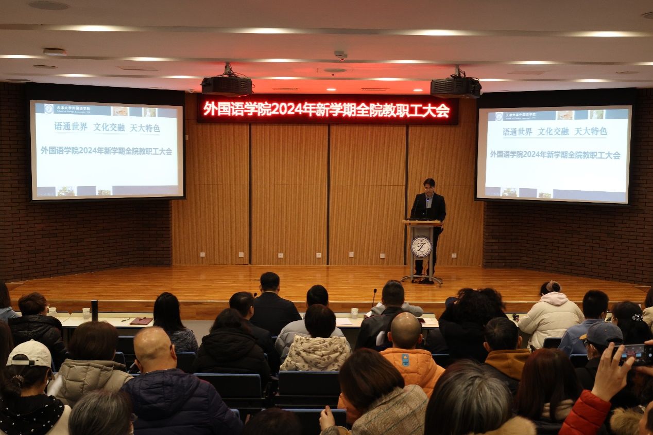 2024年2月29日上午,外国语学院全体教职工齐聚北洋园校区33教学楼160报告厅,召开2024年新学期全院教职工大会。此次大会旨在全面总结2023年工作,规划未来,凝聚共识,全力推动学院2024年各项事业高质量发展。会议由副院长刘家骥主持。