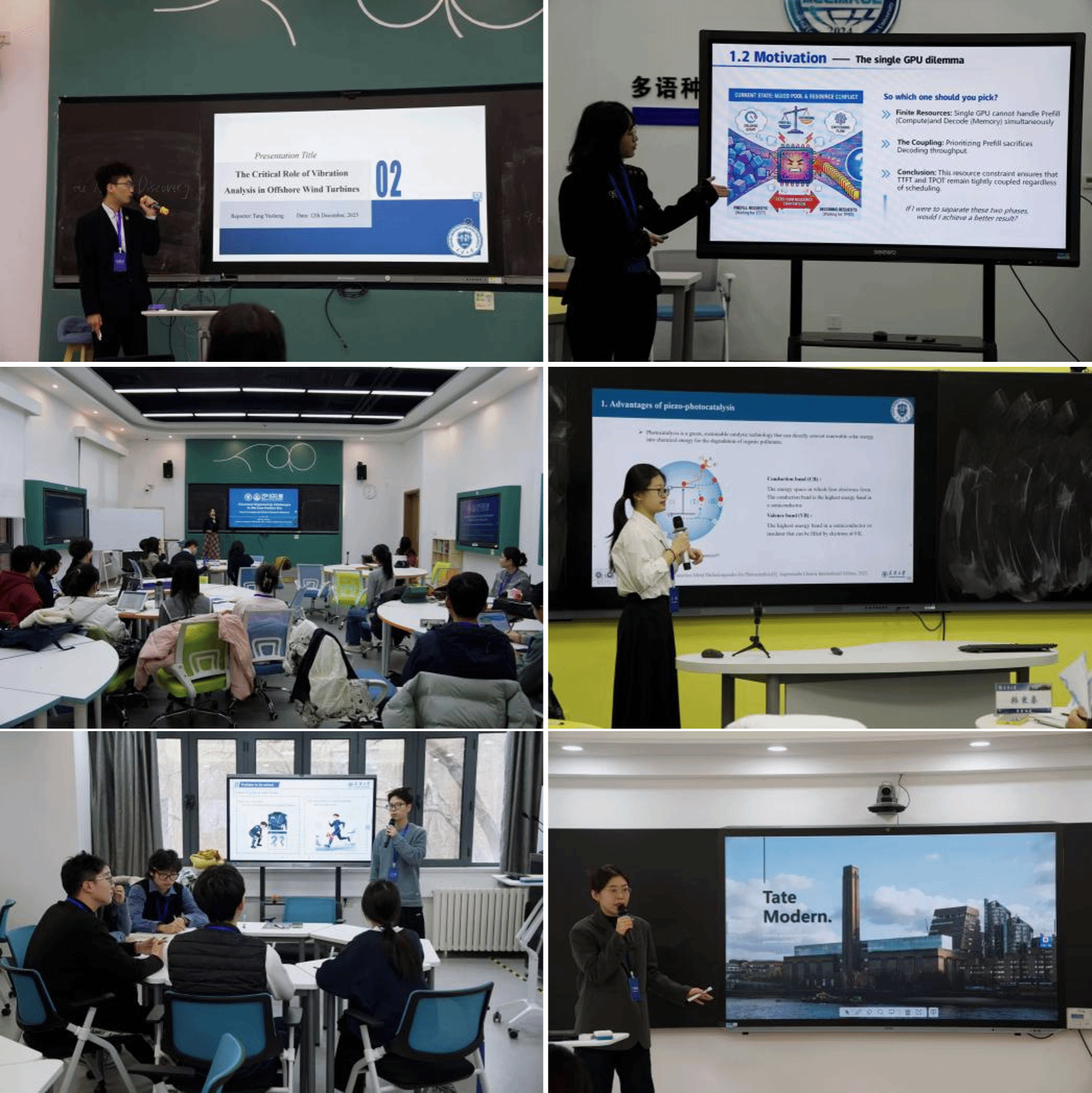 为期两天的专场活动中,各学院(部)研究生围绕前沿学科主题展开汇报。建筑工程学院“AI驱动专业技术创新”论坛上,研究生们聚焦人工智能在船舶制造、数字孪生、城市地下空间开发等领域的应用,展开深度研讨;智能与计算学部专场聚焦LLM系统前沿进展与计算机视觉跨域融合,集中呈现了从模型训练优化、系统部署到场景落地的全链条创新成果;化工学院围绕“低碳时代化工行业挑战”主题,展示了二氧化碳电催化转化、绿色催化合成等领域的关键技术突破;理学院专场将先进材料研发与健康保障、精准医疗等方向深度结合,提出了一系列创新解决方案;精密仪器与光电子工程学院通过“智能教练服”技术研讨、“GestureVision”智能交互平台成果展示等实战形式,充分锤炼了专业场景下的英语应用能力;建筑学院专场聚焦建筑巧思设计与AI赋能城市未来两大方向,深入探讨了包容性设计、智慧城建的创新路径与发展前景。