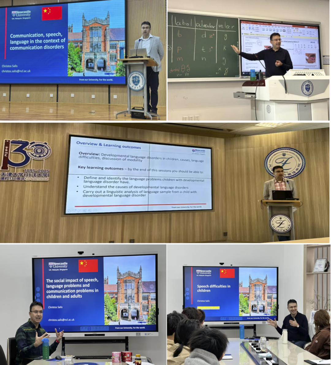 为推进跨学科国际交流、服务健康中国战略,4月7日至16日,英国Newcastle大学教育、传播与语言科学学院教授、国际权威期刊《Aphasiology》主编、语言治疗师Christos Salis应邀访问天津大学外国语学院,围绕言语语言病理学核心议题开展了为期十天的学术交流活动。访问期间,Salis教授共举办了七场系列专题讲座,与英语系教师就人工智能应用与人才培养进行专题座谈,与学院就本硕贯通培养及未来合作意向深入交流,并赴网络安全学院与魏建国教授实验室开展跨学科学术研讨。