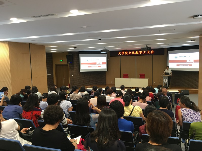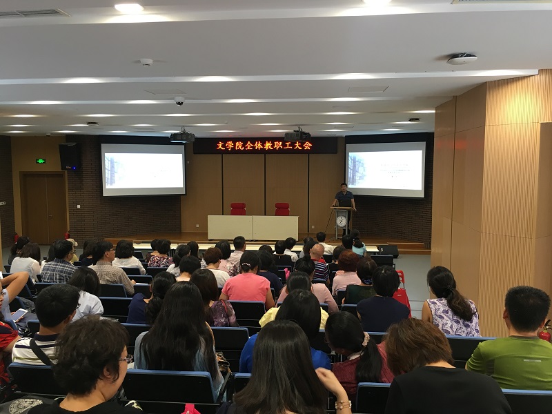 August 25, 2017, the School of Foreign Languages and Literature held the faculty general meeting and announced a new start in this semester. The meeting arranged new tasks in aspects of party building, teaching, human resources, scientific research, finance and security. Associate Dean Chen Dazhong and Wang Lisong, deputy party secretary Chang Hui as well as the teachers in different departments and administration office attended the meeting. Wang Lisong presided over the meeting.