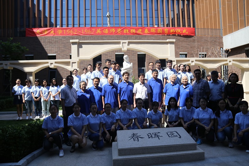 The ribbon-cutting ceremony of Chunhui Garden was held in the School of Foreign Languages and Literature (SFLL) of Tianjin University (TJU) on September 9th. Attendees include Li Jiajun, Secretary of the Party Committee of TJU, representatives of the 1962-1967 alumni of the English teacher class of TJU, Pan Feng, division chief of Tianjin University Alumni Association,Ma Xiaobao, Secretary of the Party Committee of the SFLL, Li Xu, Dean of the SFLL and over 50 representatives of teachers and students.