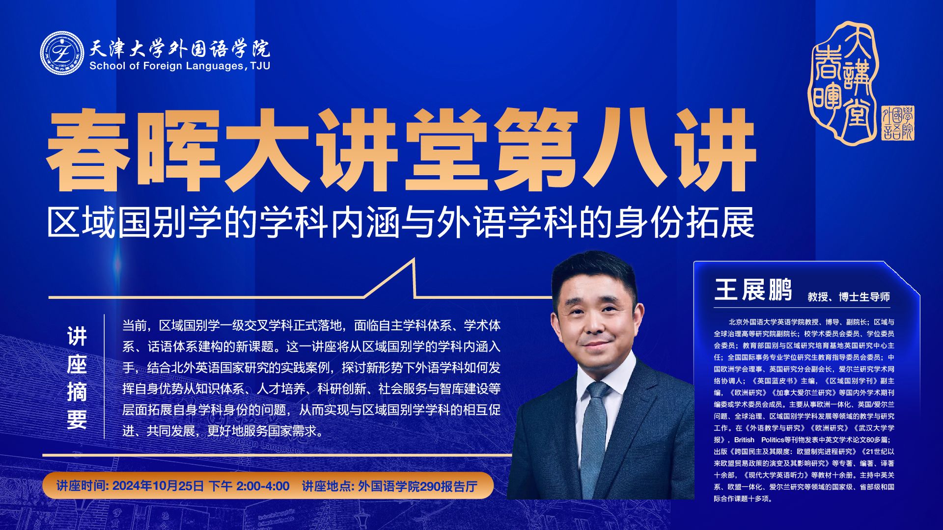 On the afternoon of October 25th, Professor Wang Zhanpeng from Beijing Foreign Studies University (BFSU) was invited to the “Chunhui Lecture” of the School of Foreign Languages, where he delivered a fascinating speech to the teachers and students in Lecture Room 290. Wang Lisong, Dean of the School of Foreign Languages, along with Dean’s assistants Wu Yulian and Gou Yanjun, and over 50 teachers and students attended the lecture. The lecture was presided over by Vice Dean Liu Jiaji.