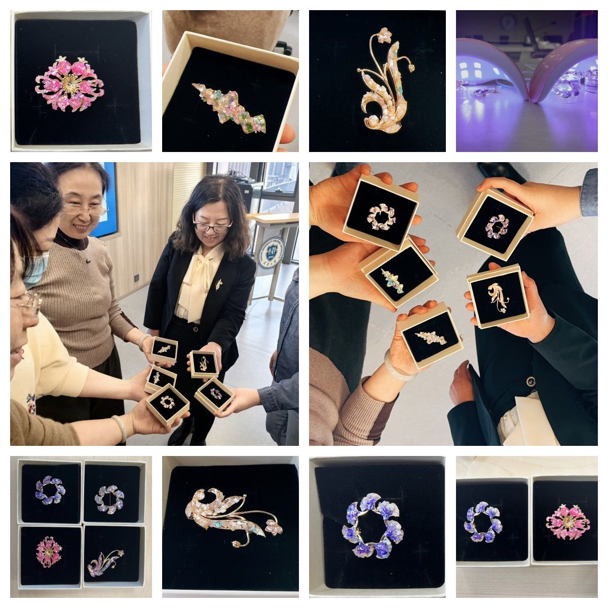 此次活动特别引入了中国传统非遗工艺——螺钿工艺,组织女教职工们亲手制作螺钿胸针。螺钿工艺,这一具有几千年历史的传统艺术瑰宝,以螺壳和海贝为原料,经过精心磨制,形成薄片后,再按照画面的需求巧妙地镶嵌在器物表面,呈现出美丽而独特的装饰效果。