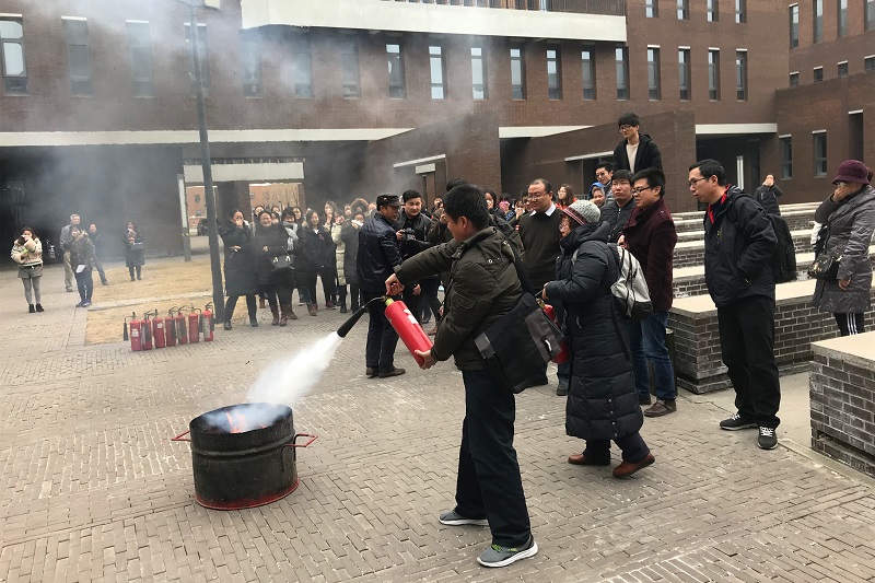 讲座结束后,举行了消防疏散演习,全体师生根据弓保津老师讲解的方法,迅速用湿巾捂住口鼻,按安全疏散路线迅速撤离至楼外。随后,结合理论知识进行了灭火器的实际操作训练,广大师生积极参与,掌握了灭火器的正确使用方法。