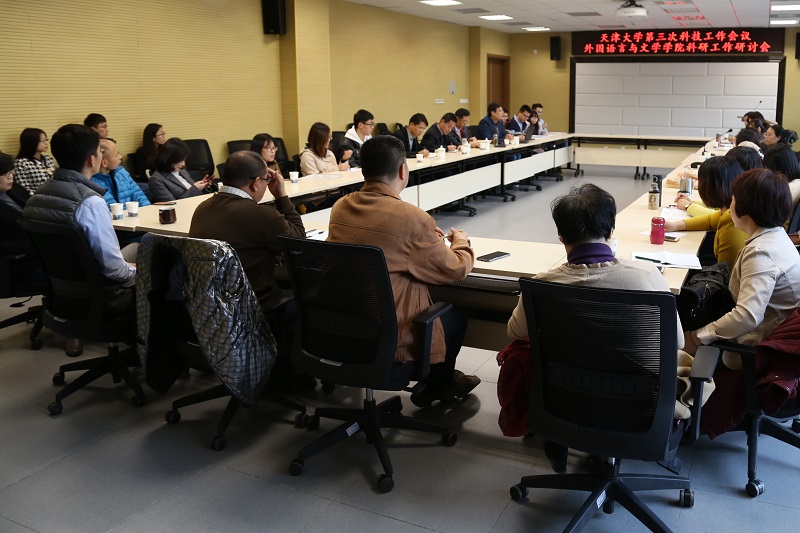 日前,天津大学第三次科技工作会议隆重开幕,为传达会议精神,研讨科研工作方案,11月28日,外国语言与文学学院召开了科研工作会。院长李旭,党委书记马小宝,副院长王立松、刘家骥,各系部党支部书记、主任、副主任,中青年教师代表以及学生代表参加了会议。