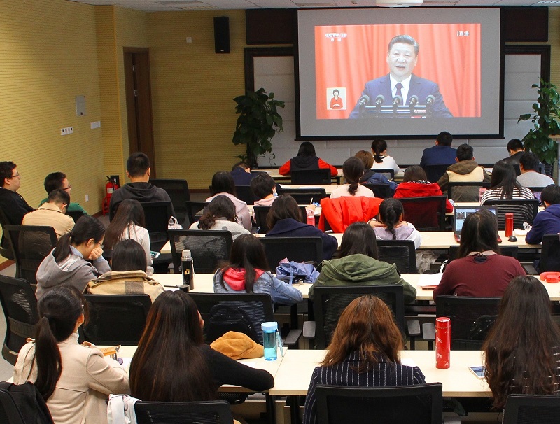 广大师生认真听取、学习了习近平总书记的报告,对党中央关于我国目前主要矛盾的变化、中国特色社会主义发展进入新时代以及新时代中国特色社会主义按照两个阶段安排、习近平新时代中国特色社会主义思想、贯彻新发展理念、建设现代化经济发展体系等论断展开了交流探讨,为中国共产党带领全国各族人民取得的伟大成就深感自豪,大家纷纷表示,一定与党中央保持一致,坚定理想信念,志存高远,脚踏实地,为实现中华民族伟大复兴的中国梦而努力奋斗。