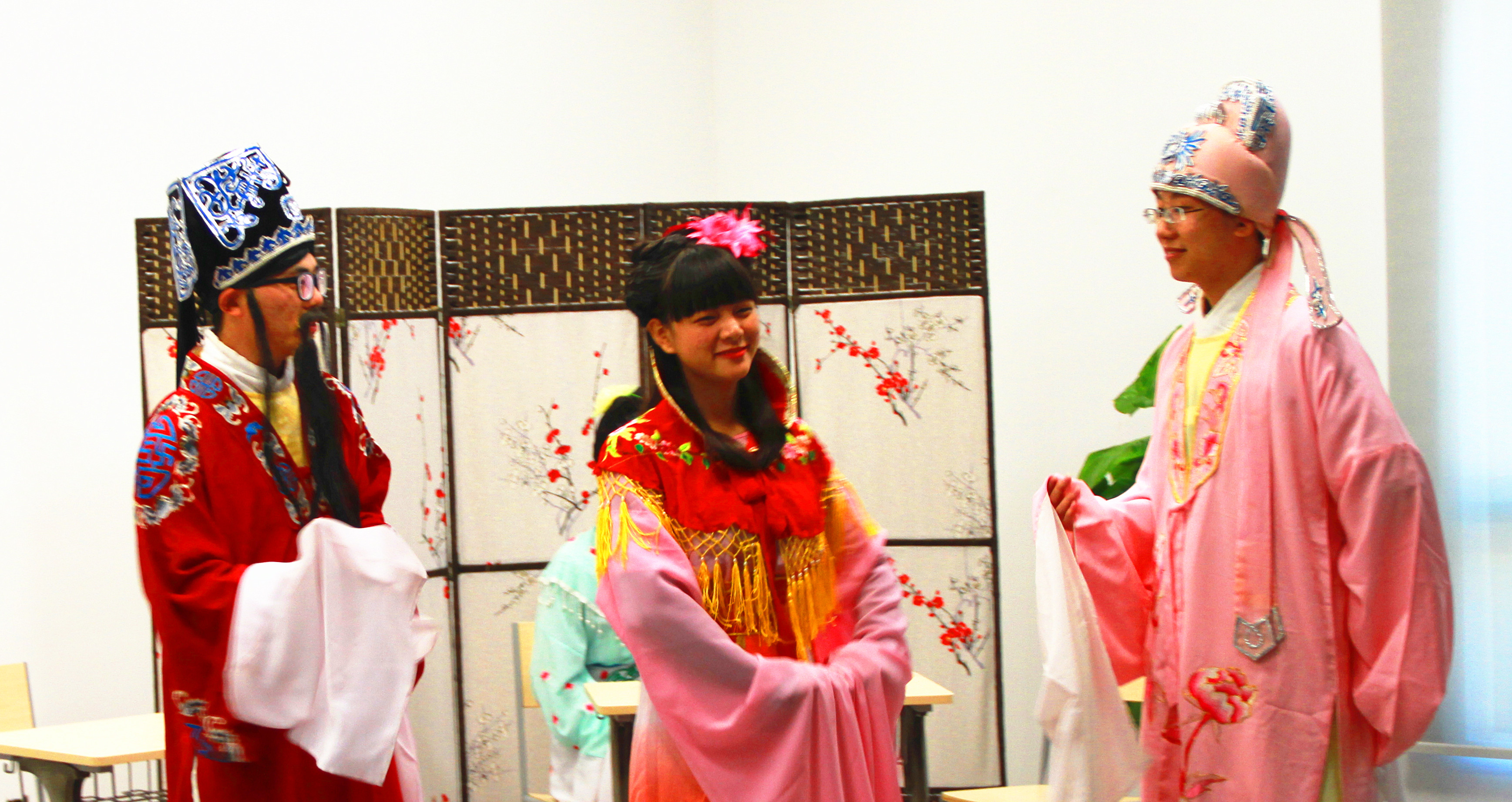 10月2日下午两点,北洋园第33教学楼教学演播室内,2012级与2013级汉语言文学专业的学生穿上传统戏服,准备好古典道具,给校友们带来了一场精彩的古装表演《新狮吼记》,该剧改编自北宋时期著名文人陈季常与其妻柳月娥“河东狮吼”的故事:陈季常与苏轼、秦观等文友聚会,期间有歌妓表演助兴,此事被柳氏得知,于是她罚夫跪池。苏轼前来解围也被柳氏赶出,由此上演了一出家庭和谐剧。该剧以全新的视角和独具特色的切入点阐释了中国自古以来的传统家文化,在此基础上,更结合文学院自身发展基调,通过典雅的语言风格和演员们淋漓尽致的表演,尽情演绎了这一传统文学典故。
