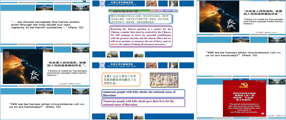 在17日开始教学周中,很多老师结合课程进度,调整充实了教学内容。在英语阅读教学课堂中,结合教材“我们身边的英雄”话题,通过列举新时代十年伟大变革中的英雄模范人物,引导同学们深入探讨英雄的定义,深刻理解"人民是历史的创造者,是真正的英雄""新时代的伟大成就是党和人民一道拼出发现敏感词“来、干”,该词语可能会导致文章提交到某些网站发表不成功,建议重点检查。出来、奋斗出来的"。在翻译教学中,引入《CHINADAILY》有关党的二十大报告摘要英译,鲜活的时政素材使教学更加生动,既讲授了翻译的理论和技巧,又宣讲了党的二十大报告,促进同学们深化对“中国式现代化”“踔厉奋发、笃行不怠”“江山就是人民、人民就是江山”等时政语汇的理解和应用。在听说课堂中,组织学生共同收看有关党的二十大的英文宣传视频,进而讲解英文表达。组织学生畅谈党的二十大,用英语说一说:2996位党员代表参加党的二十大。他们代表全国的多少位党员?来自什么行业?平均年龄是多少?来自多少个民族?女性代表有多少?教育水平是怎样的?全方位了解党的二十大,做中国故事的讲述人。