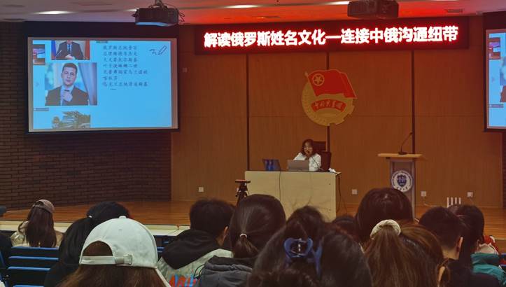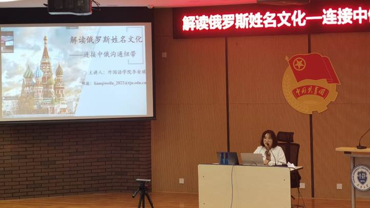 李博士毕业于莫斯科国立大学,现就职于天津大学外国语学院。主要研究方向为中国文学和俄罗斯文学对比研究,女性文学研究,中俄跨区域文化对比研究。在本次讲座上,她结合自己的研究方向,用生动有趣的语言和清晰明了的例子深入浅出地为听众讲解了俄罗斯的姓名文化。