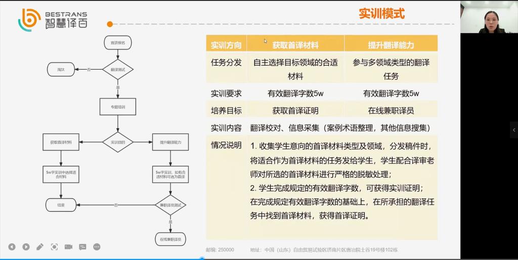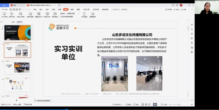 1月11日山东智慧山东智慧译百企业实习线上宣讲活动顺利举行,企业介绍了公司基本情况、实习实训内容,天津大学外国语学院60余名在校研究生参与宣讲活动,同学们反响热烈,积极提问,企业相关负责人就同学们关心的实训模式、实训周期、首译材料、字数折算方式等问题作了认真解答。外国语学院MTI教育中心相关负责老师参会。