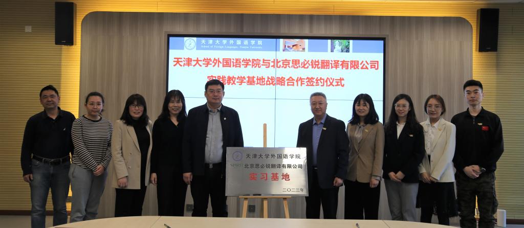 3月1日上午,外国语学院同北京思必锐翻译有限公司共建实践教学基地战略合作签约仪式在天津大学北洋园校区33楼290会议室举行。主持学院工作的王立松院长、翻译硕士教育中心执行主任邬丽娜和武玉莲、翻译硕士教育中心老师殷世宇以及北京思必锐翻译有限公司总经理许立群、资源管理总监马丽莹、培训部经理刘雅堃、质检部经理尕松永措、总经理助理杨超等出席了会谈并参加了签约仪式。