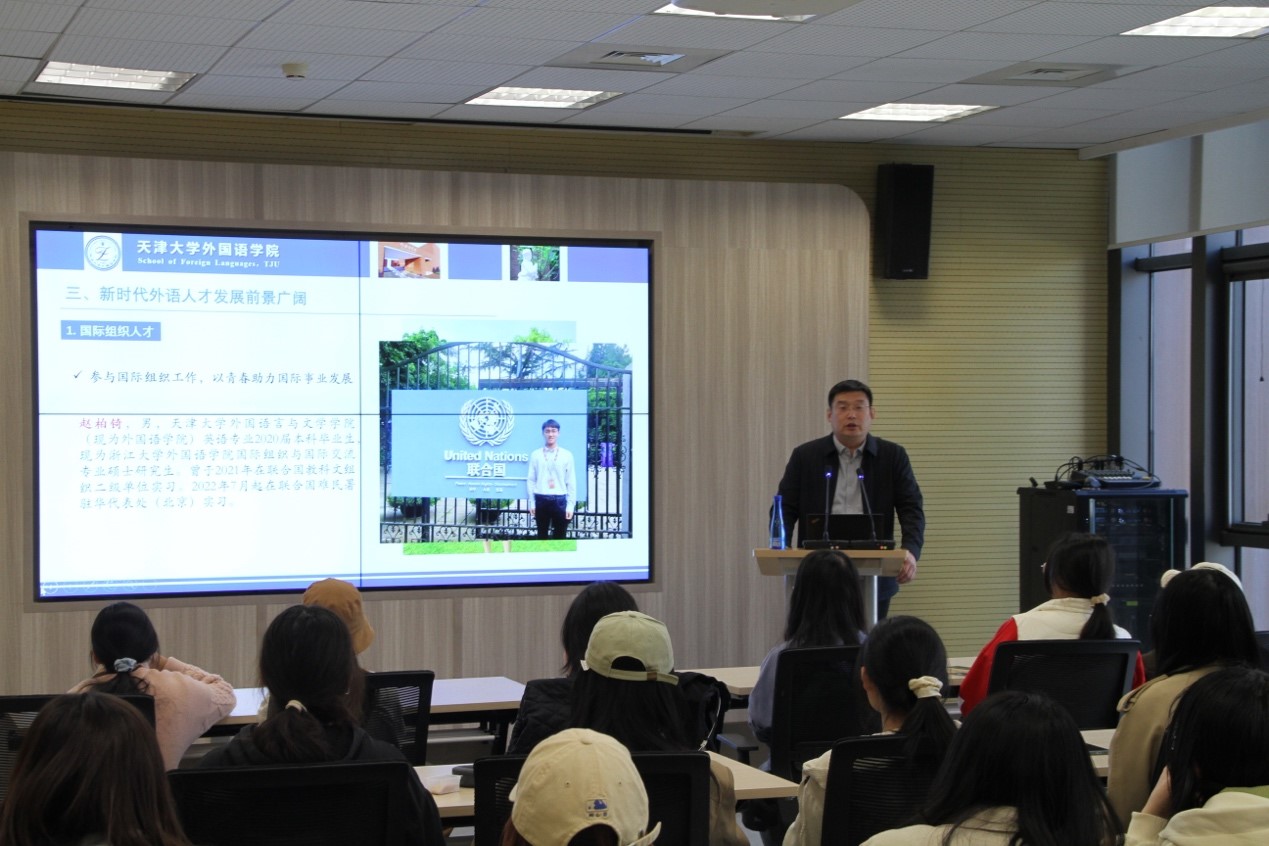 谈及新时代外语人才的发展前景,王立松指出,“新文科”背景下,外语人才应锚定“外语+”成长道路,在不断夯实外语能力的同时,努力提升跨学科思维和跨学科能力,进而满足国家和社会对复合型外语人才需求。此外,王立松还援引学院英语专业往届毕业生赵柏锜赴联合国教科文组织等国际组织实习、周笑瑜参加北京金砖国家青年论坛代表中国青年于国际舞台发声的生动事迹,引导与会学生不断拓展国际视野,坚定“外语+”成长信念。