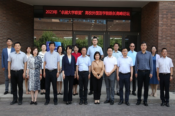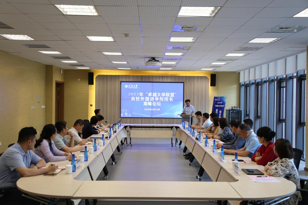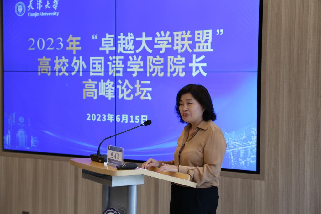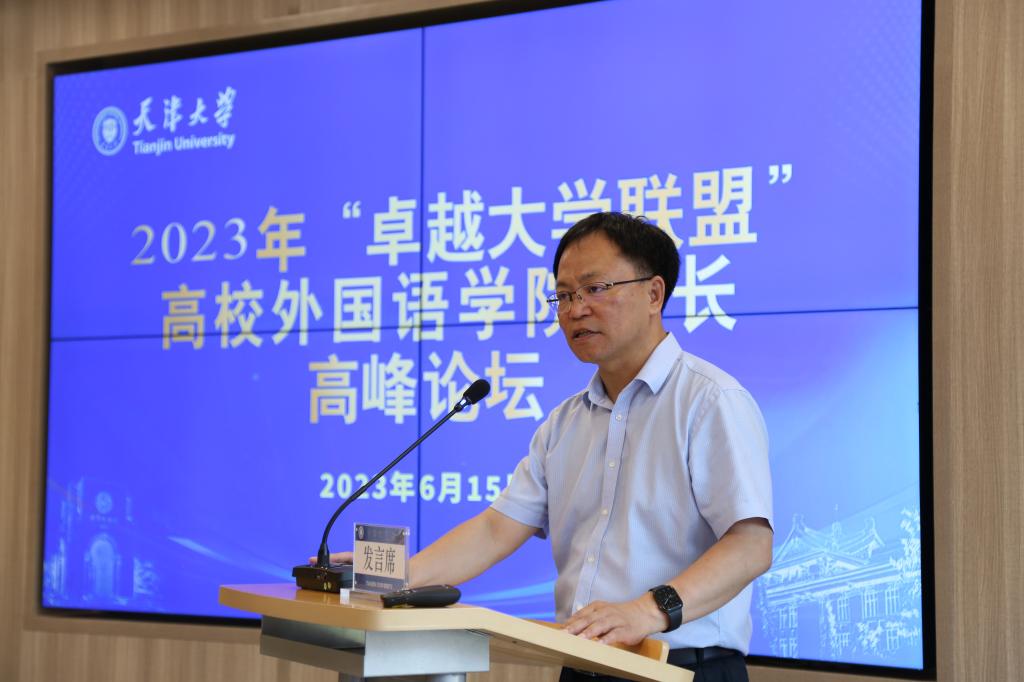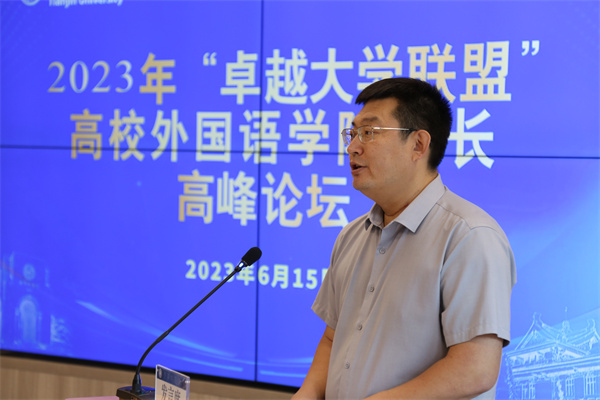 新时代新征程,党和国家对高素质复合型国际化人才的需求更加迫切。习近平总书记指出,深化中外交流,增进各国人民友谊,推动构建人类命运共同体,讲好中国故事,需要大批外语人才,外语院校大有可为。为加强“卓越大学联盟”成员高校之间交流与合作,进一步发挥外语学科在人才培养、科学研究、中外人文交流、文化传承与创新等方面的重要作用,不断推动外语学科发展建设水平,2023年6月15日“卓越大学联盟”高校外国语学院院长高峰论坛在天津大学举行,来自“卓越大学联盟”高校的外国语学院院长和学者们参加了论坛。天津大学党委常委、副校长马新宾出席并致辞,天津大学党委常委、统战部部长、社科处处长、文科办主任张俊艳,天津大学外国语学院全体领导班子成员参加了开幕式,论坛开幕式由外国语学院王立松主持。