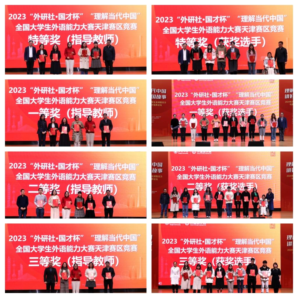 2024年天津市大学生全球胜任力与国际化人才培养论坛召开之际,为2023“外研社•国才杯”“理解当代中国”全国大学生外语能力大赛英语组国赛的天津获奖选手及指导教师进行颁奖。参赛师生于大赛中洞鉴古今、闳中肆外,生动诠释了新时代青年传播中国声音的使命和担当。