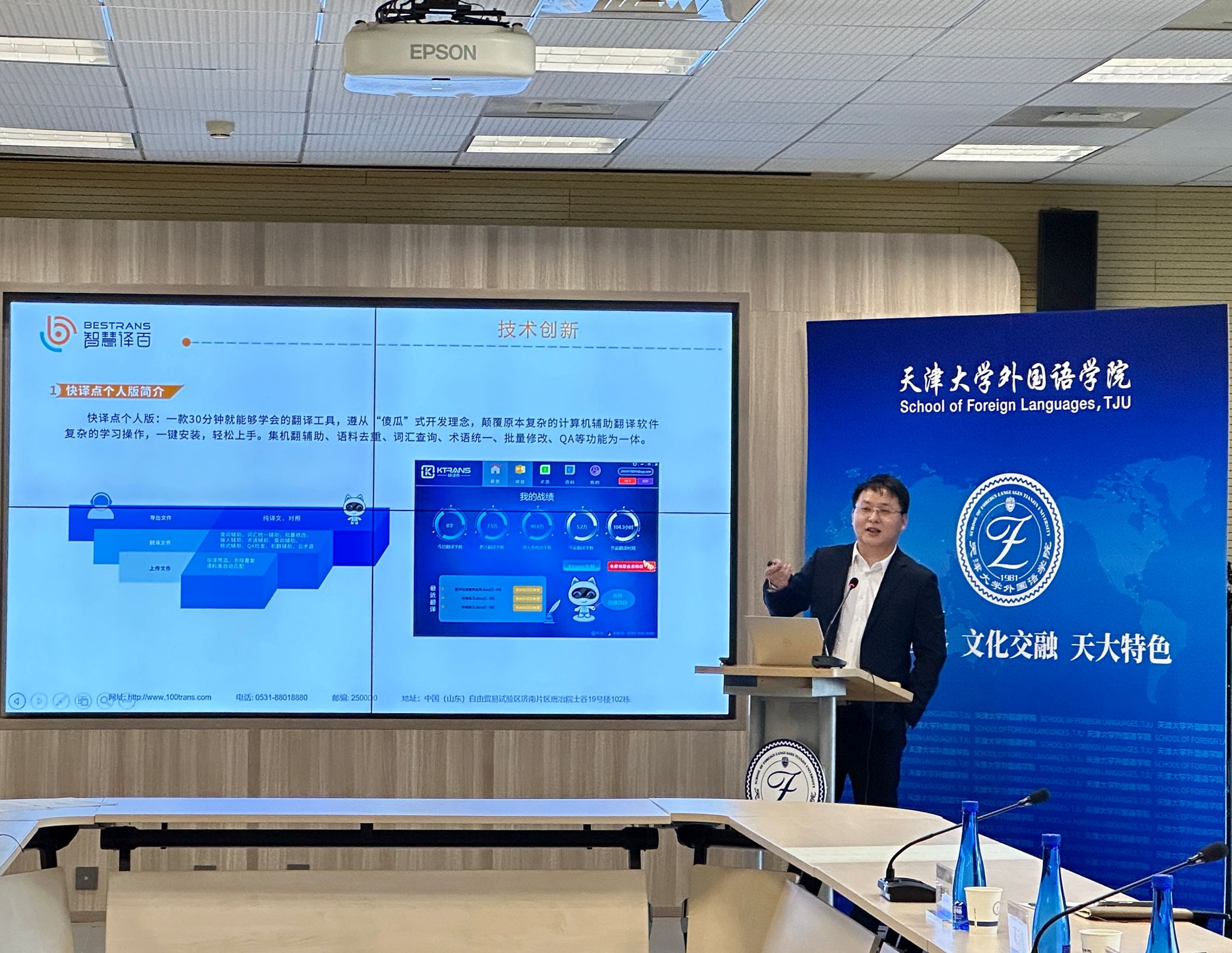 11月28日下午,山东智慧译百信息技术有限公司CEO江心波应我院邀请,在学院290报告厅为师生们带来了一场精彩讲座。外国语学院副院长肖振凤,翻译教育中心主任殷世宇,以及师生五十余人参加了本次讲座。讲座由殷世宇主持。