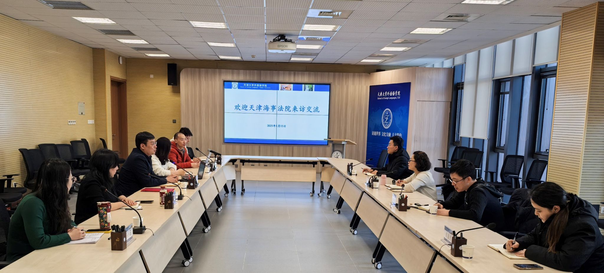 1月15日下午,天津海事法院审管办(研究室)副主任张颉,四级高级法官张良,综合审判庭法官助理霍新宇,审管办(研究室)法官助理司晨雨一行四人来访外国语学院,学院院长王立松,副书记常慧,院长助理、多语种教学部主任勾艳军,多语种教学部副主任、党支部书记李俊凯,多语种教学部副教授马杰,多语种教学部教师孙小涵参加座谈。