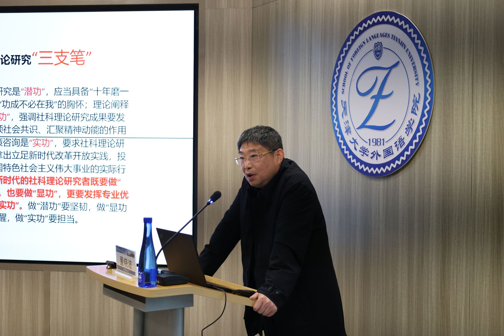 其次,董教授阐述了智库研究与国家发展战略的紧密联系。他强调,哲学社会科学工作者应当肩负起为党为民述学立论、建言献策的责任;外语教师则应充分认识智库研究的重要性,积极推进自身转型,为学院专业改革储备师资力量,助力国家优秀外语人才培养。