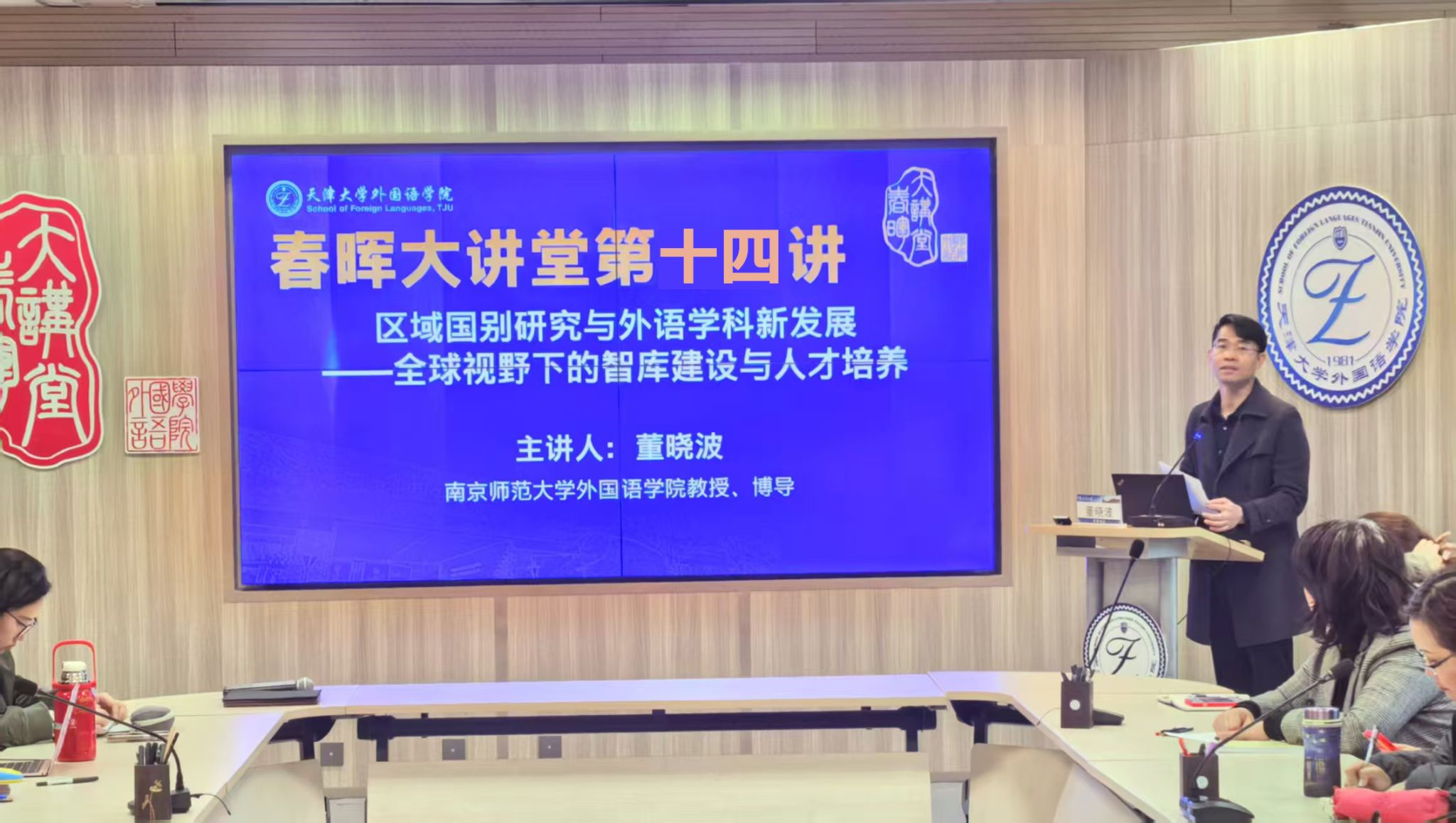 3月28日下午,外国语学院特邀南京师范大学外国语学院董晓波教授担任“春晖大讲堂”第十四讲的主讲嘉宾,本次讲座以“区域国别研究与外语学科新发展——全球视野下的智库建设与人才培养”为题,系统剖析外语学科在新时代的使命重构与发展路径。学院党委书记张文礼、副院长刘家骥及师生50余人参加了本次学术讲座。