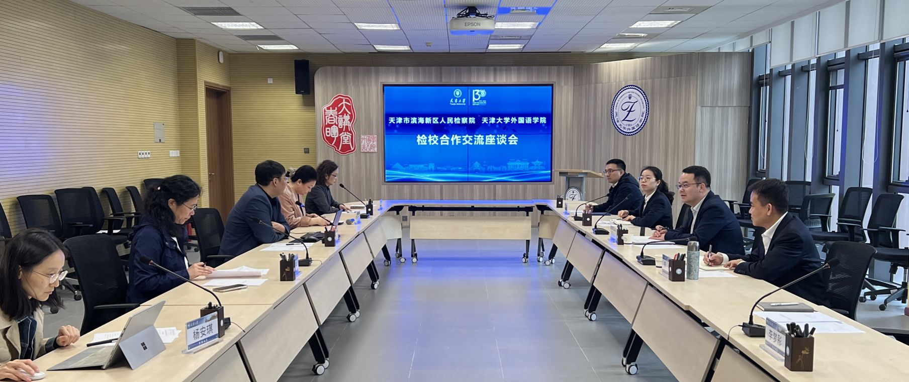 为深入贯彻落实党的二十大精神,服务国家涉外法治建设,深化校检协同创新,4月18日,天津大学外国语学院与天津市滨海新区人民检察院举行检校合作交流座谈会。外国语学院院长王立松、党委副书记常慧等学院领导及教师代表出席会议,与滨海新区人民检察院党组副书记、副检察长曹纪元,党组成员、副检察长李杨一行就涉外法治人才联合培养、课题共研及研修基地共建等合作事项展开深入交流。
