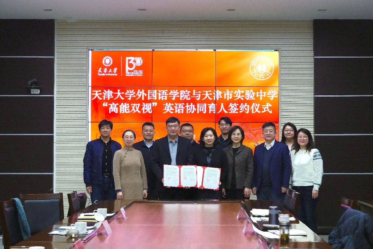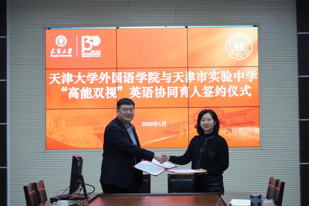 随后,王立松与刘晓婷共同签署《天津大学外国语学院与天津市实验中学“高能双视”英语协同育人合作协议书》。