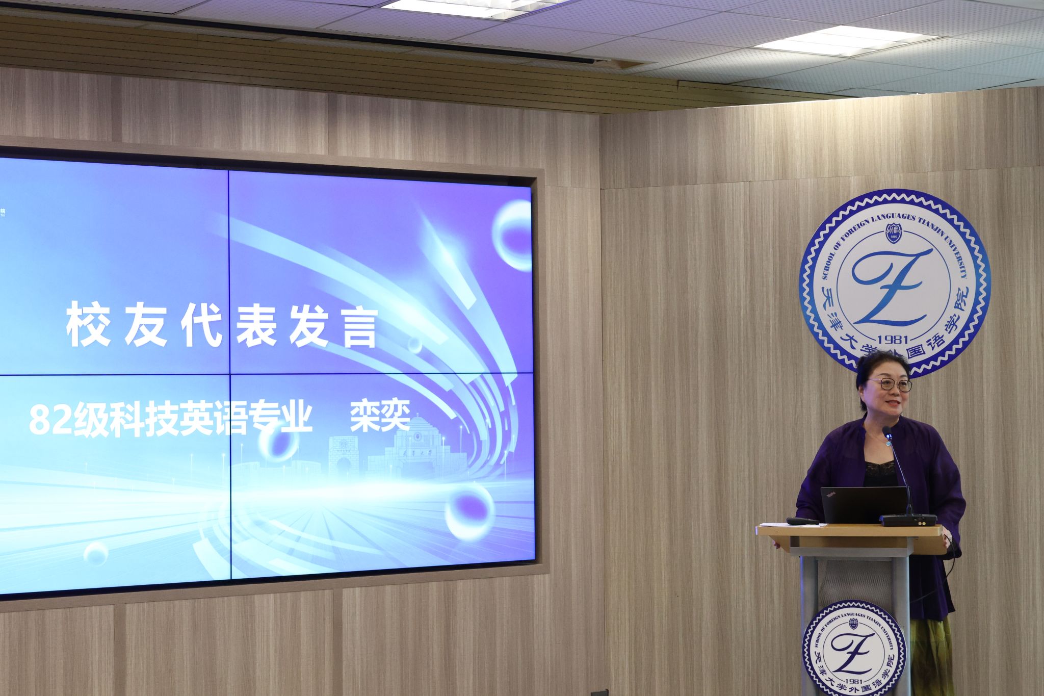 来自不同年代的校友代表依次登台发言。82级科技英语专业校友高小杰感恩母校的培养,在校所学令其有了立身之本,求学生涯中师长的教诲培养了其端正的人生态度,并表示愿继续发光发热,持续关心学校和学院发展。82级科技英语专业校友栾奕从母校培育、跨界成长以及家庭传承几个方面谈及个人奋斗历程,饱含了对母校的深情。83级科技英语专业校友林夕宝分享了以“实事求是”深耕教育之路的创业历程,生动诠释了将母校校训转化为教育创新动力的坚守与突破。91级科技英语专业校友杨震回顾求学岁月,感念母校培育之恩,盼与学弟学妹共话成长。92级科技英语专业校友郝景辉谈到,求学阶段天津大学外语系所展现出的人文关怀、跨