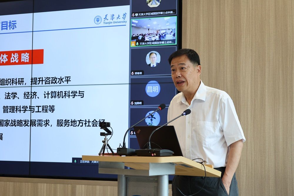 6月7日上午,天津大学自主审核新增区域国别学博士学位授权点专家论证会在北洋园校区33教学楼290多功能厅顺利召开。论证会专家组成员包括(按姓氏拼音排序):中山大学区域国别研究院院长、高校国别和区域研究人才培养与学科建设联盟秘书长陈杰教授,四川大学国际关系学院院长、国务院学位委员会区域国别学学科评议组成员李志强教授,山东大学东北亚学院院长、国务院学位委员会区域国别学学科评议组成员刘昌明教授,北京语言大学国别和区域研究院院长、教育部国别和区域研究工作秘书处主任、国务院学位委员会区域国别学学科评议组成员罗林教授,北京外国语大学英语学院副院长、区域与全球治理高等研究院副院长王展鹏教授,吉林大学东北亚研究院院长、国务院学位委员会区域国别学学科评议组成员吴昊教授,同济大学外国语学院博士生导师、国务院学位委员会区域国别学学科评议组成员郑春荣教授。天津大学发展规划处副处长张立迁、研究生院学位办公室主任刘庆岭和秦朝霞老师、外国语学院班子成员和我校相关学院区域国别学学科骨干教师参加论证会。