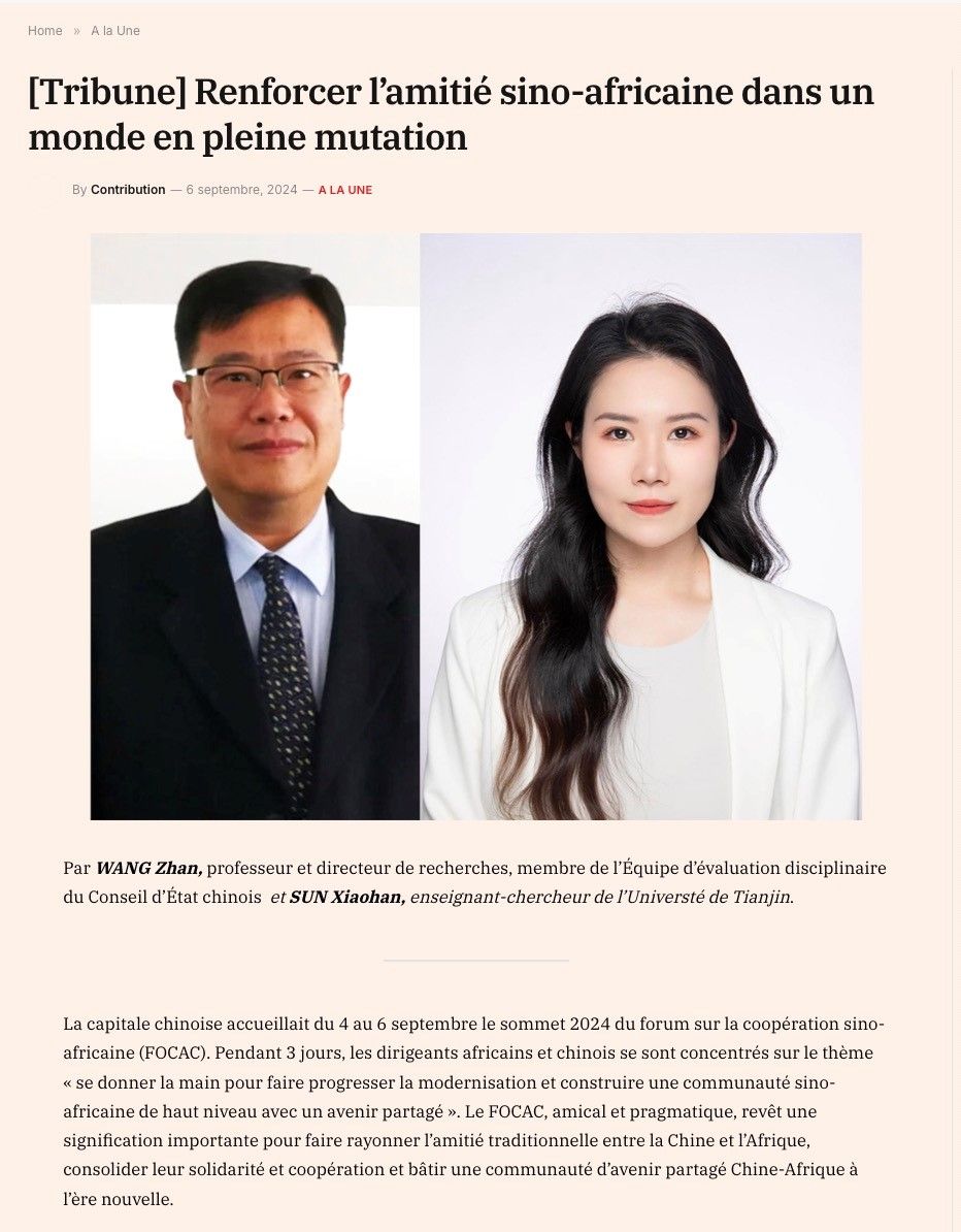2024年9月4日至6日,中非合作论坛峰会在北京隆重召开,标志着中非友谊与合作进入了一个新的历史阶段。在此之际,外国语学院英才教授王战与讲师孙小涵在非洲重要新闻媒体《非洲金融时报》(Financial Afrik)上发表了题为《在不断变化的世界中加强中非友谊》的评论文章,就中非合作论坛峰会以及深化中非友谊发表评论。