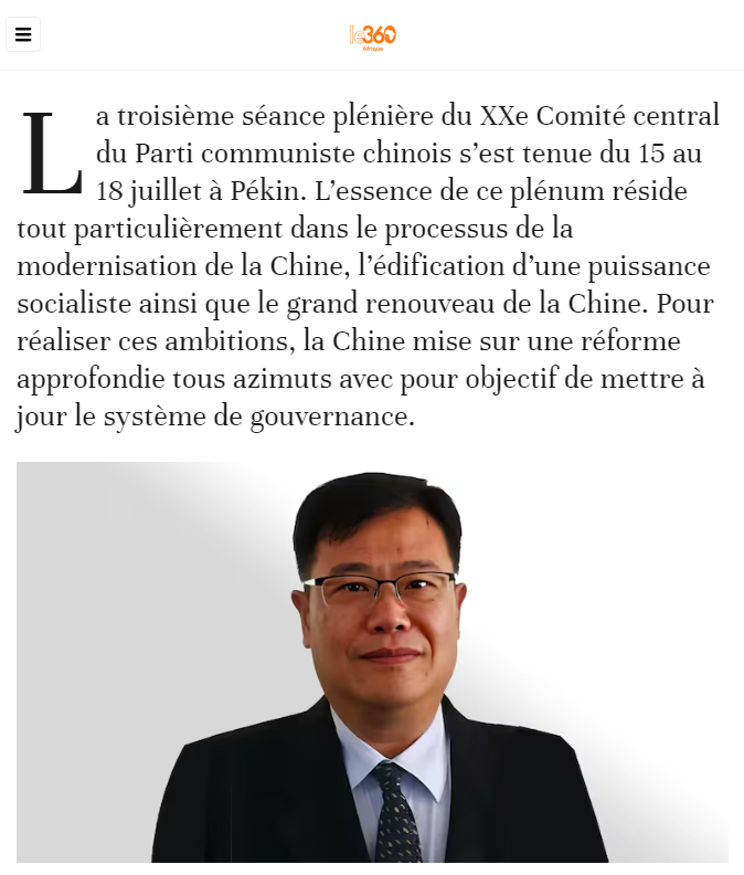 中国共产党二十届三中全会胜利召开,举世瞩目,意义重大,包括非洲在内的世界各国高度关注。日前,我院王战教授在摩洛哥主流新闻媒体“全景非洲”(Le 360 Afrique)就党的二十届三中全会以及中非文明交流互鉴发表了评论文章。
