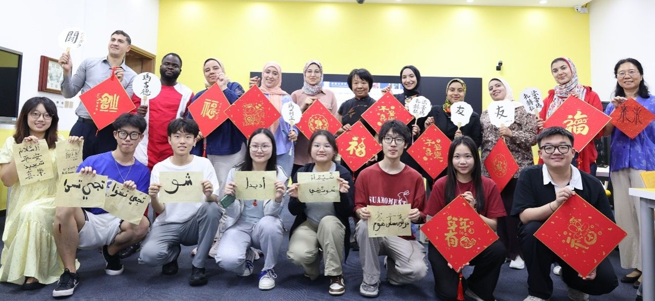 墨香氤氲的教室里,一场别开生面的汉字体验课正在进行。杨朝桂老师以深厚的书法功底,指导两国学生执起毛笔,从“友”字的一撇一捺开始,学习汉字的结构与神韵。当饱含祝福的“福”字跃然纸上时,笔墨的交流已悄然化为心意的相通,无声地传递着对友谊长存的美好祝愿。